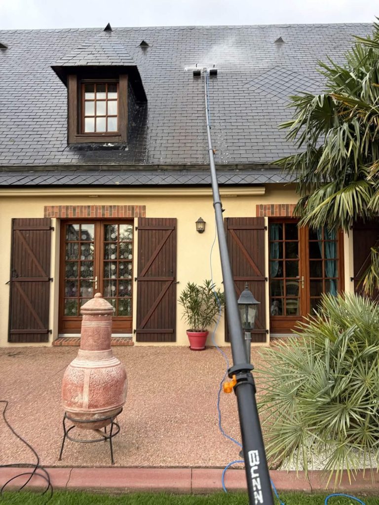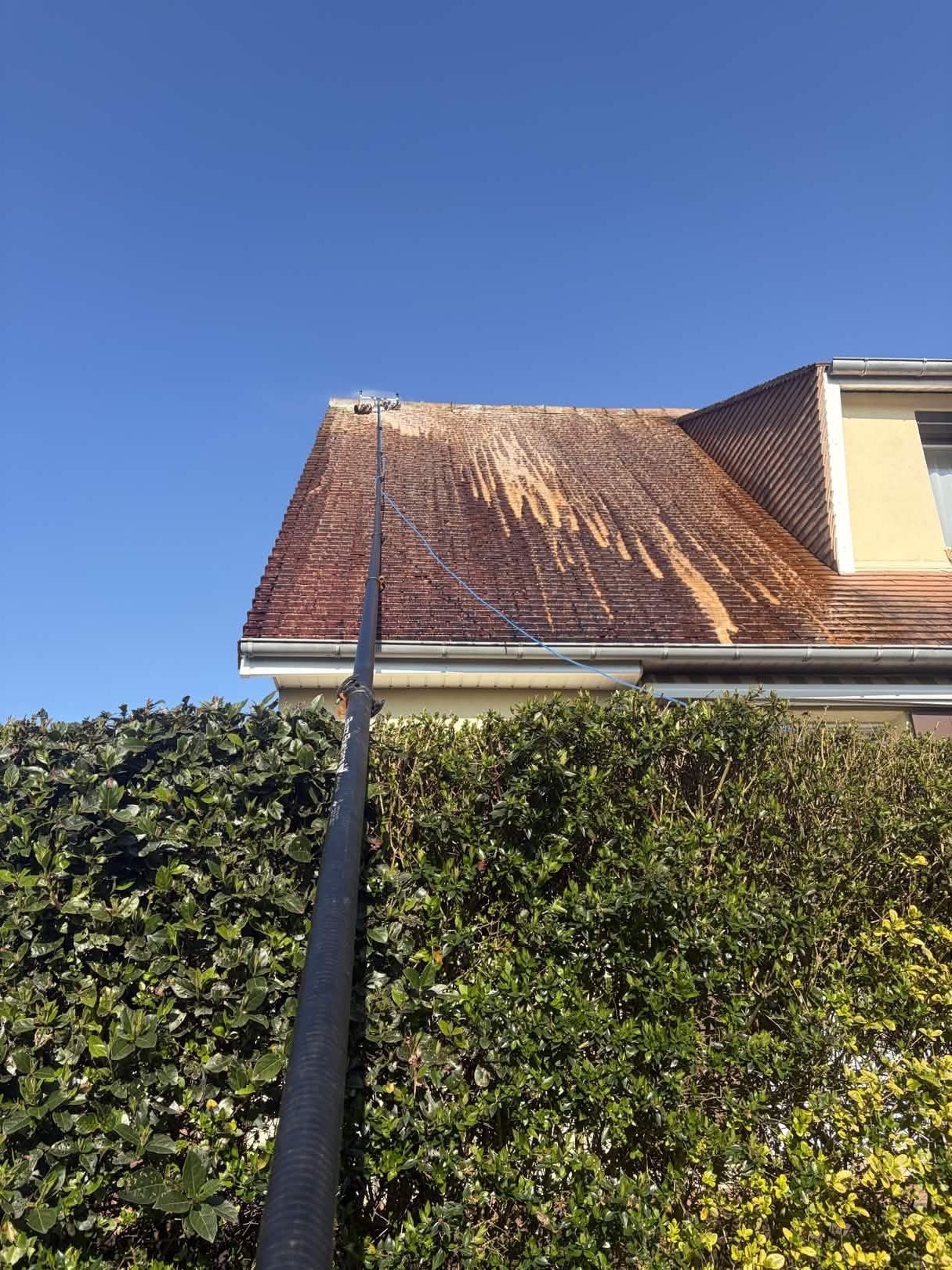 Application manuelle du démoussant avec perche et rouleau, sans haute pression.