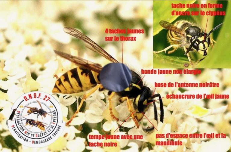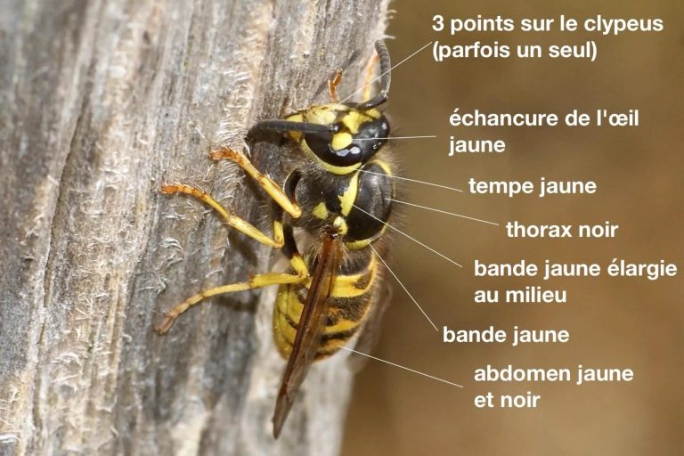 Cependant, une différence visible permet de les distinguer : la guêpe germanique possède généralement trois petits points noirs (parfois un seul) entre les yeux, alors que la guêpe commune présente plutôt une tache noire plus large et diffuse.