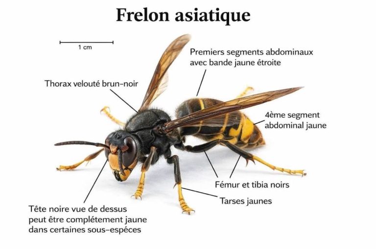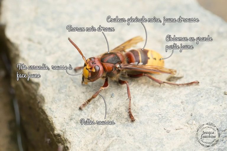 Le frelon européen (Vespa crabro) est le plus grand hyménoptère présent en Europe. Sa taille peut être deux à trois fois supérieure à celle d’une guêpe. Il se distingue du frelon asiatique par sa morphologie plus imposante, ses rayures jaunes et noires bien visibles, ainsi que par son thorax de couleur rousse et ses antennes brun-roux.